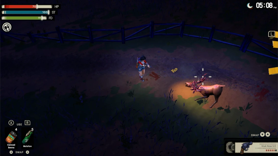 玩家需搜集物资、制作工具、建造避难所,并在黑暗中潜行躲避“鹿头人”等神秘追猎者。