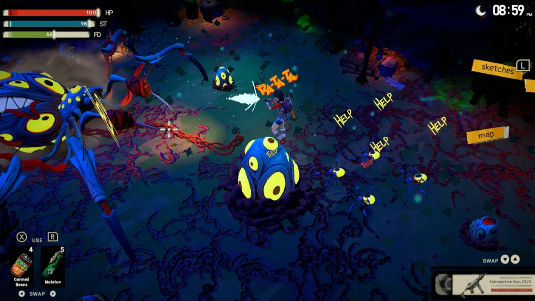 游戏大胆采用复古美漫画风,粗犷线条、浓烈色彩与80年代风情交织,营造出怪诞而迷人的恐怖氛围。更特别的是,声音以视觉化文字呈现:脚步声显示为“沙沙”,篝火爆裂作“噼啪”,仿佛在阅读一本动态漫画,极大增强沉浸感。